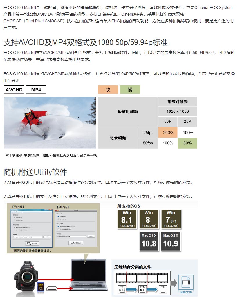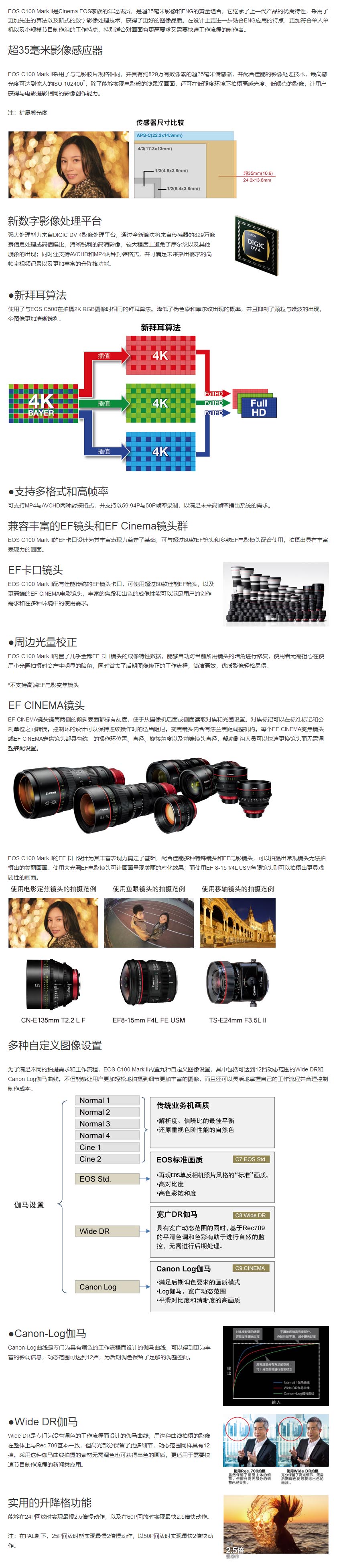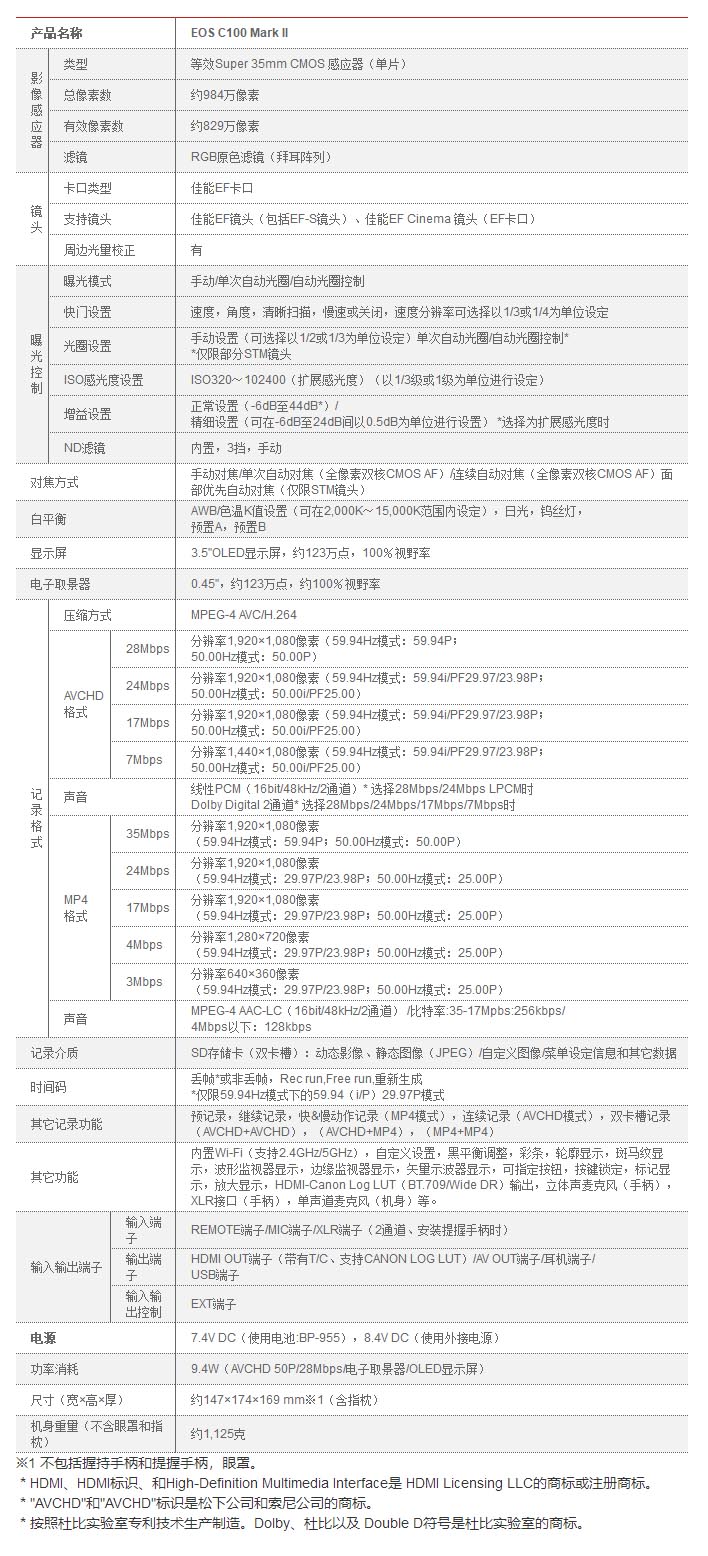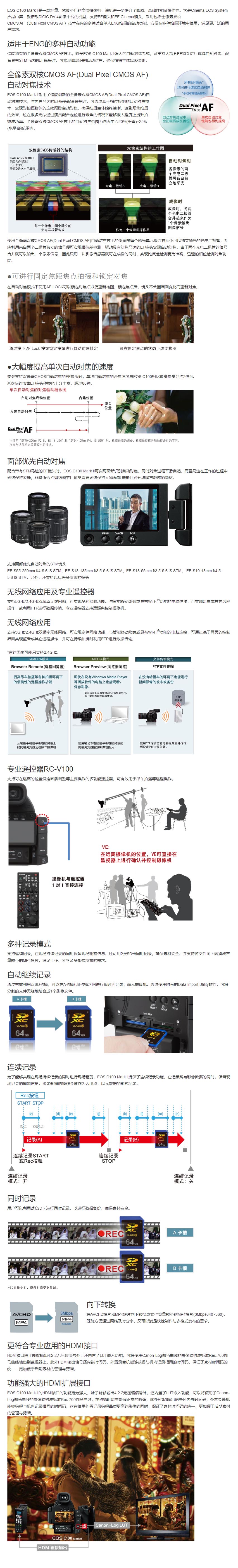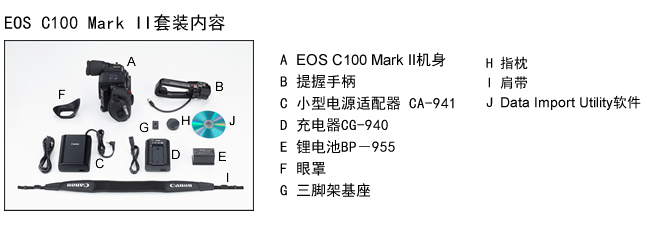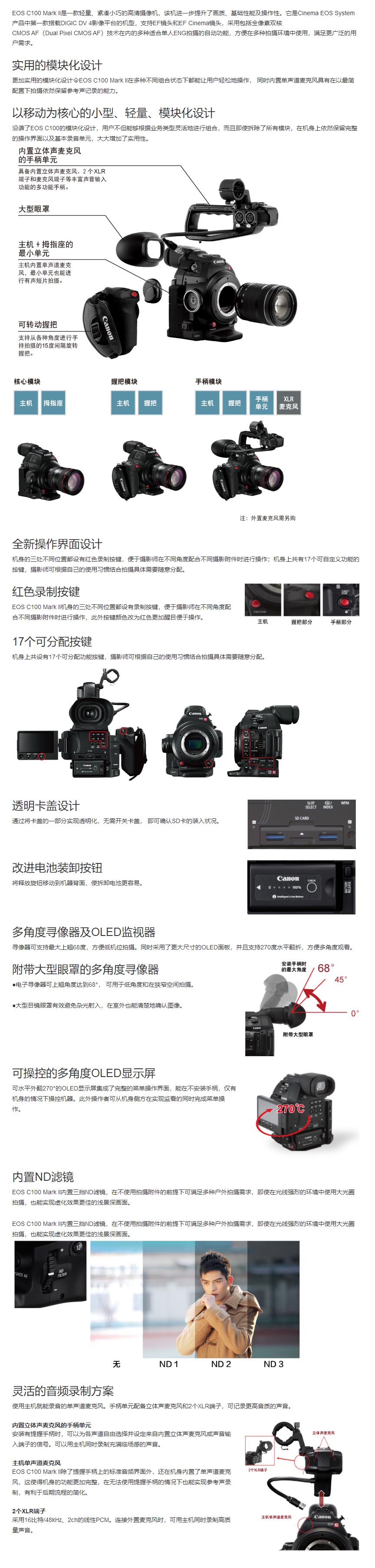 EOS C100 Mark II 是一款轻量、紧凑小巧的高清摄像机,该机进一步提升了画质、基础性能及操作性。它是Cinema EOS System产品中第一款搭载DIGIC DV 4影像平台的机型,支持EF镜头和EF Cinema镜头,采用包括全像素双核CMOS AF(Dual Pixel CMOS AF)技术在内的多种适合单人ENG拍摄的自动功能,方便在多种拍摄环境中使用,满足更广泛的用户需求。,