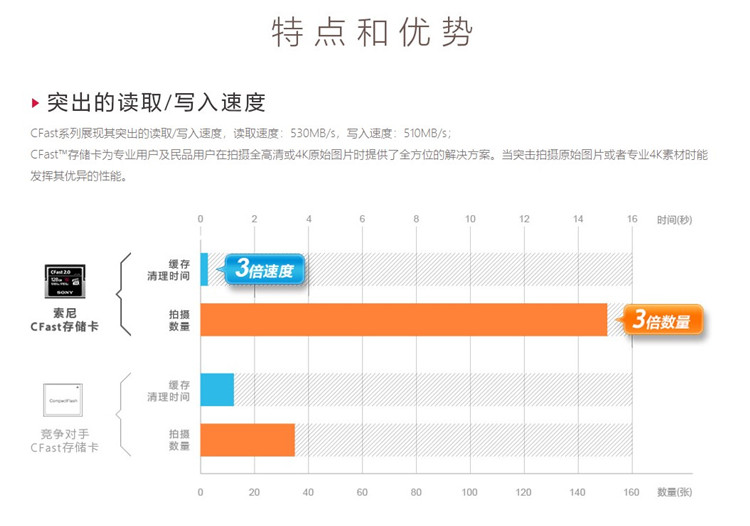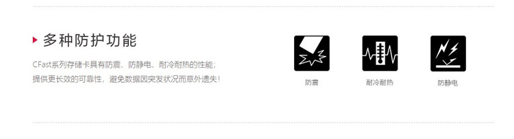 商品描述:适用于有CFast卡槽的主机/530MB/s读取速度。/适合专业用户。/当突击拍摄原始图片或者专业4K素材时能发挥其卓越的性能。,