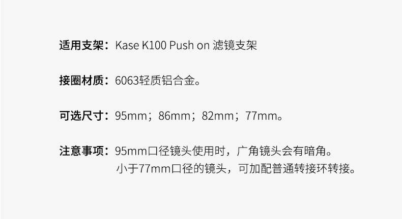 Kase卡色 K100 Push on 支架专用接圈 95 86 82 77mm 支架接环