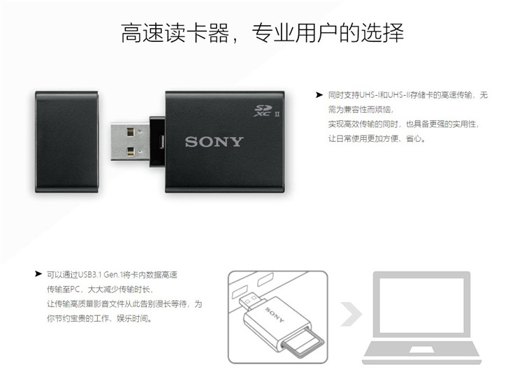 索尼 支持UHS-I和UHS-II存储卡 / 可以通过USB3.1 Gen.1将卡内数据高速传输至PC SD卡读卡器 存储卡 USB3.0