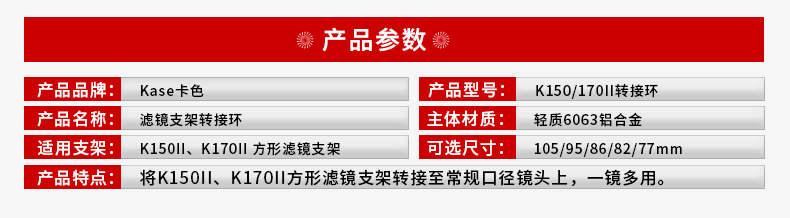 Kase卡色 K150II K170II 方形滤镜支架转接环 二代支架转接环