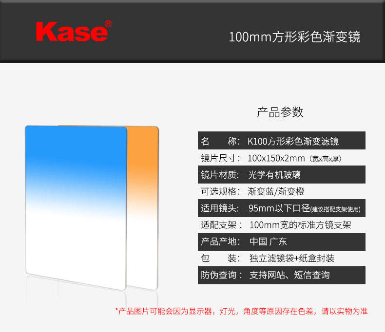 Kase卡色 方形渐变镜 100mm 100x150mm 渐变蓝 天空镜 渐变橙 日落镜 彩色渐变方形插片滤镜 方镜