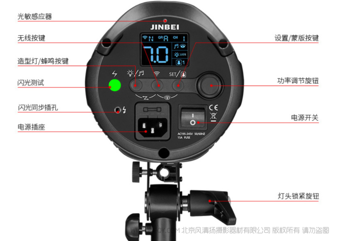 | 功率/指数 | 1000Ws/GN98 | 回电提醒 | LED显示 f蜂鸣提示音 造型灯同步亮暗 |