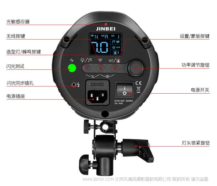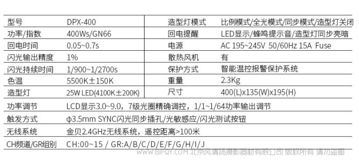 | 功率/指数 | 400Ws/GN66 | 回电提醒 | LED显示 f蜂鸣提示音 造型灯同步亮暗 |