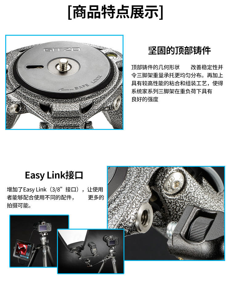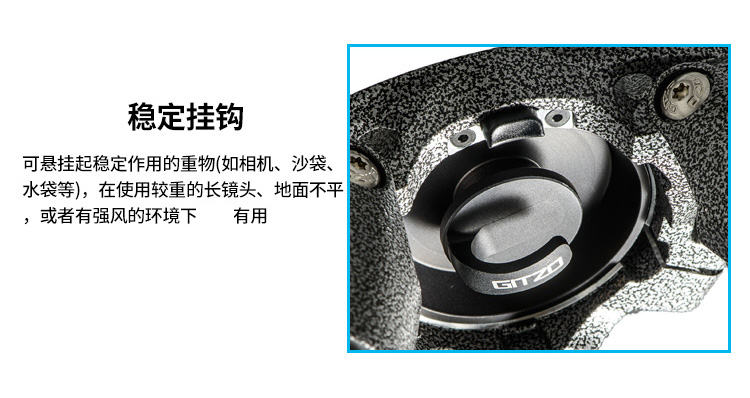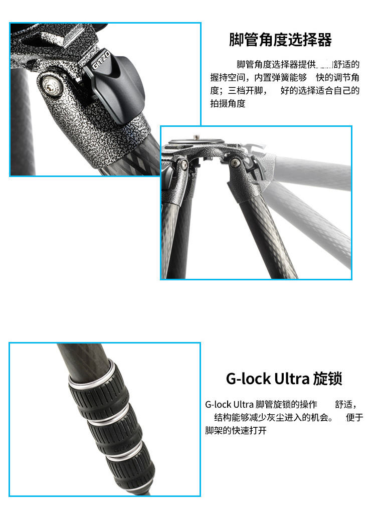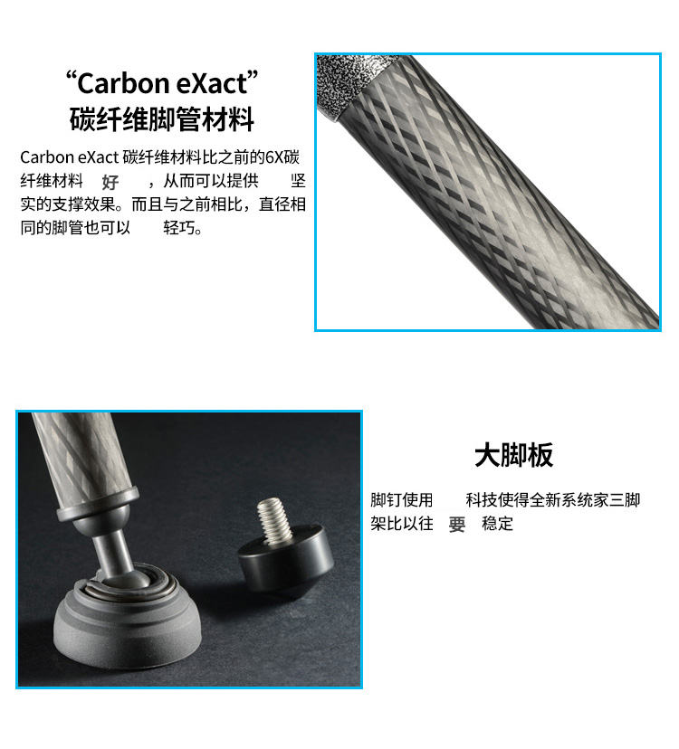 坚固的顶部铸件 Easy Link接口 脚管角度选择器 G-lock Ultra旋钮 Carbon eXact碳纤维脚管材料 大脚板 稳定挂钩