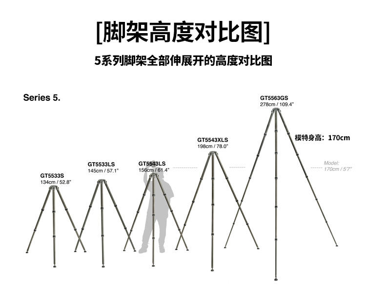 捷信 GT5543LS 5号 碳纤维三脚架 无中轴 新款系统家系列4节碳纤维三脚架