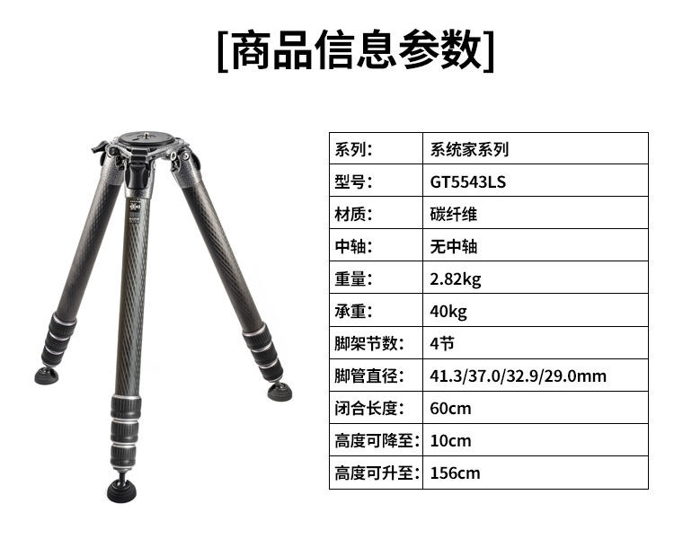 脚管角度选择器提供手感舒适的握持空间,内置弹簧能够更快的调节角度;三挡开脚,好的选择适合自己的拍摄角度 GT5543LS,40kg,2.82kg,60cm,