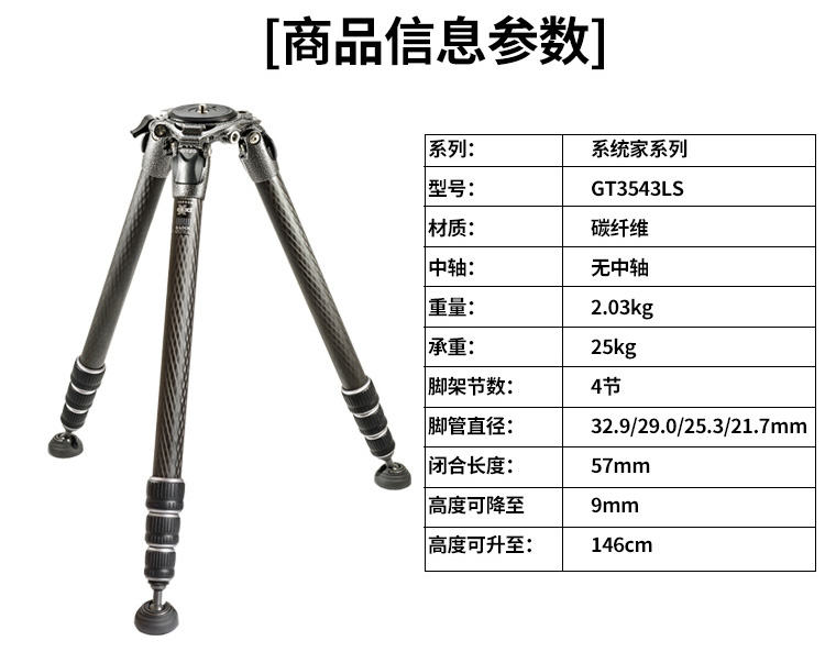 捷信 GT3543LS 系统家 3号 碳纤维4节三脚架 无中轴 easylink接口 脚管角度选择器 g-lock ultra旋锁