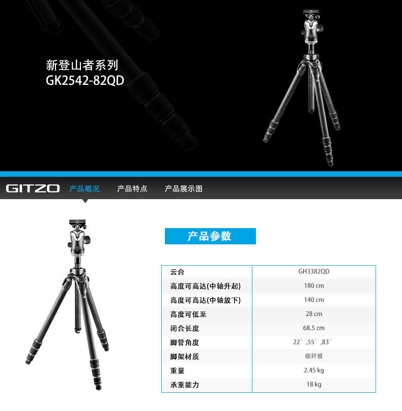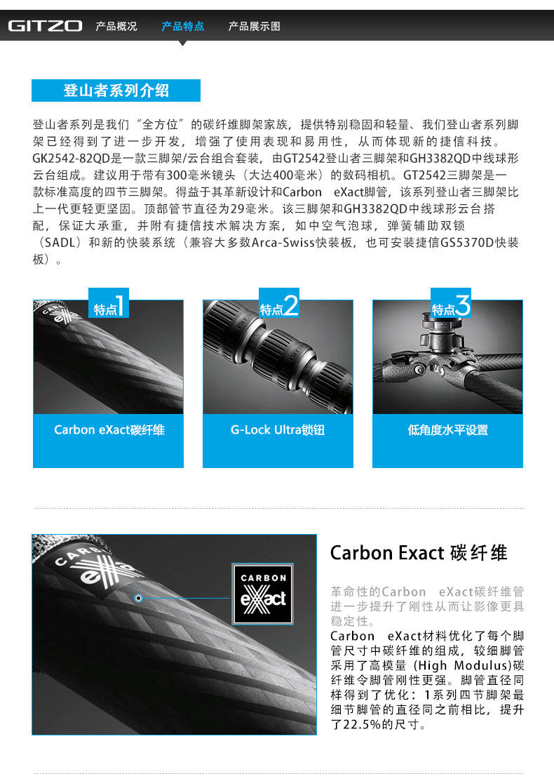 捷信 Gitzo GK2542-82QD 登山者系列2号碳纤维4节三脚架云台套装 碳纤维