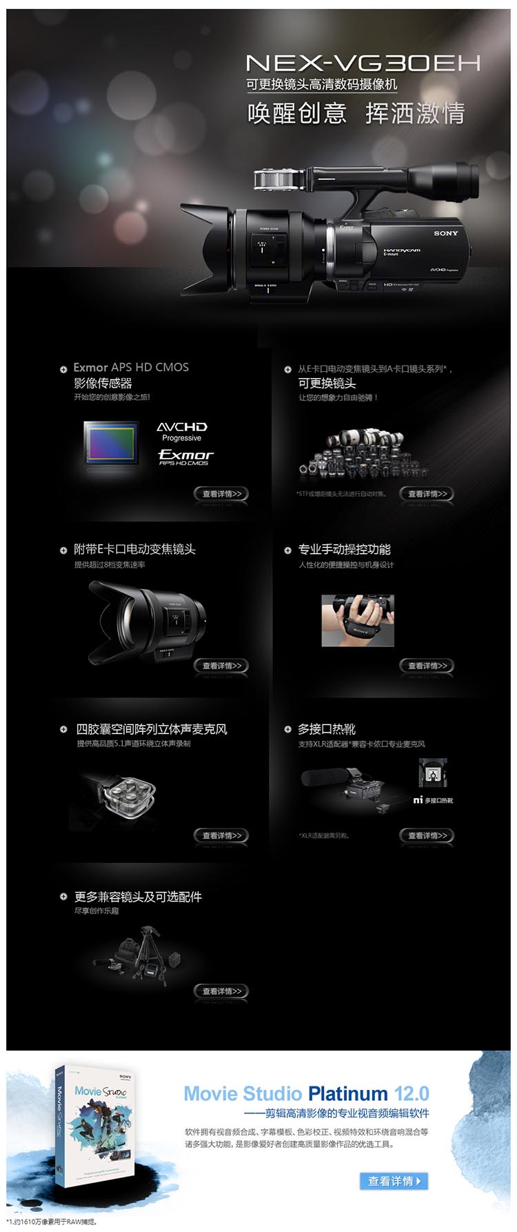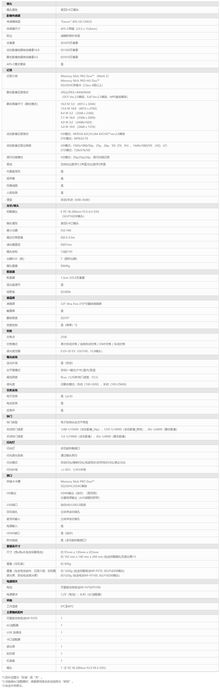商品描述:标准机身NEX-VG30/约1610万有效像素Exmor APS HD CMOS/可更换镜头(E卡口)/1920x1080 24p、25p、50p高清视频录制/约1610万像素静态图像拍摄*1/四胶囊空间阵列立体声麦克风/随机附带E PZ 18-200mm F3.5-6.3 OSS (SELP18200)/适合多种拍摄场景,大变焦效果理想,轻松拍摄广阔风景,抓拍人物表情或精彩赛事,
