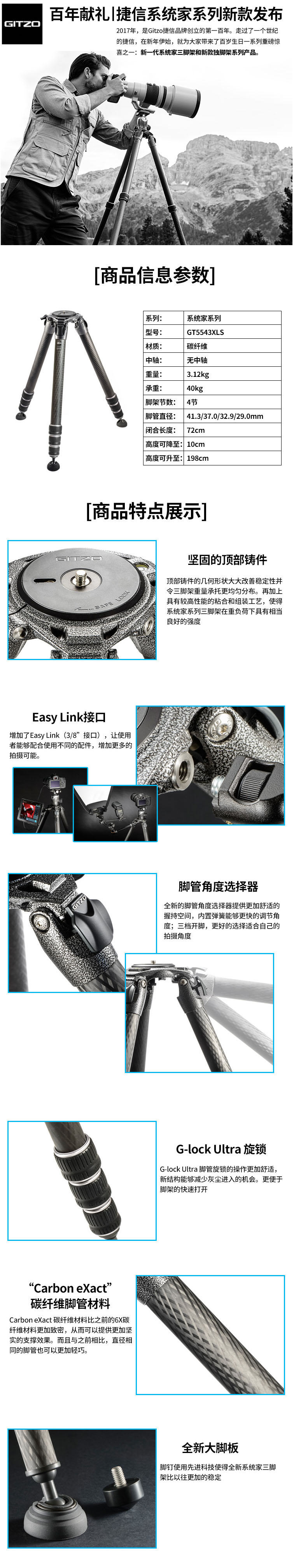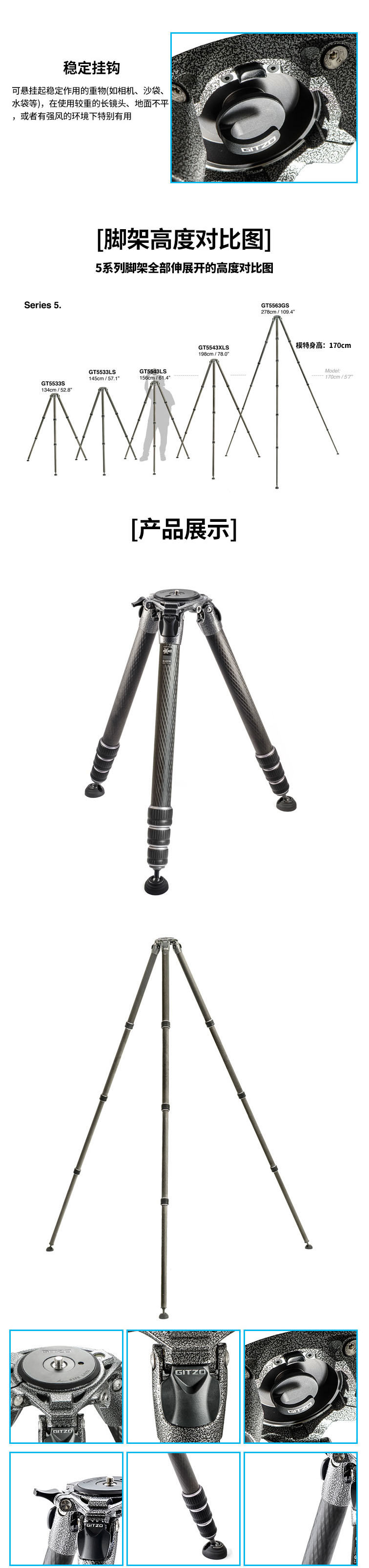 捷信 GITZO GT5543XLS 全新 系统家 碳纤维 观鸟 摄影 摄像 无中轴 加长型 三脚架
