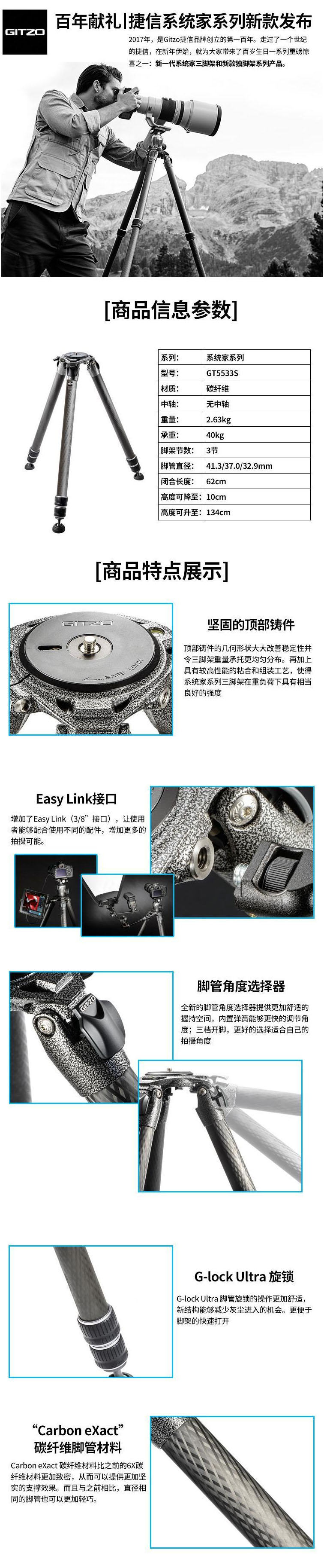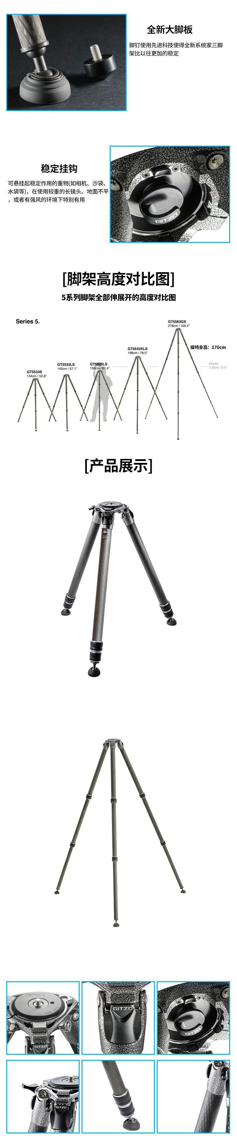 捷信 GITZO GT5533S 全新 系统家 碳纤维 观鸟 摄影 摄像 无中轴 三节 三脚架 5系3节碳纤维三脚架