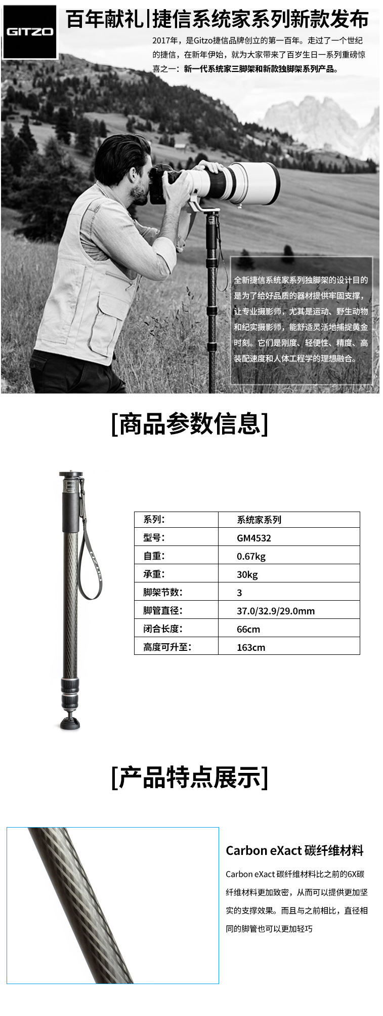 捷信 GITZO GM4532 163cm 工作高度 系统家 碳纤维 独脚架 3节 eXact碳素 摄影 数码 单反 相机 支架 捷信4系3节碳纤维独脚架