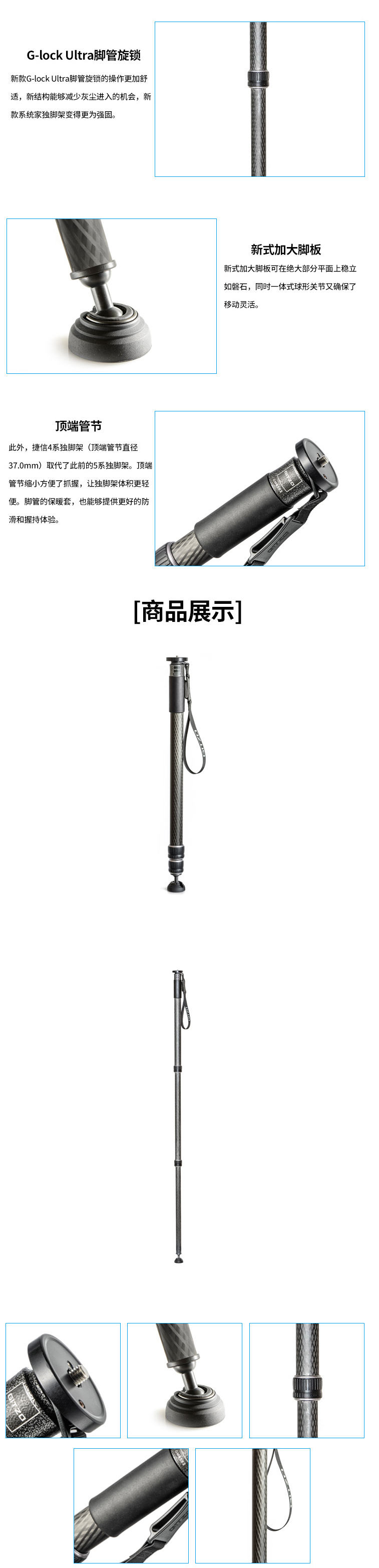 捷信GM4532 4系3节碳纤维独脚架是新增的3节独脚架,携带时架身较长,但开启速度快,在同系独脚架中结构较为坚固。