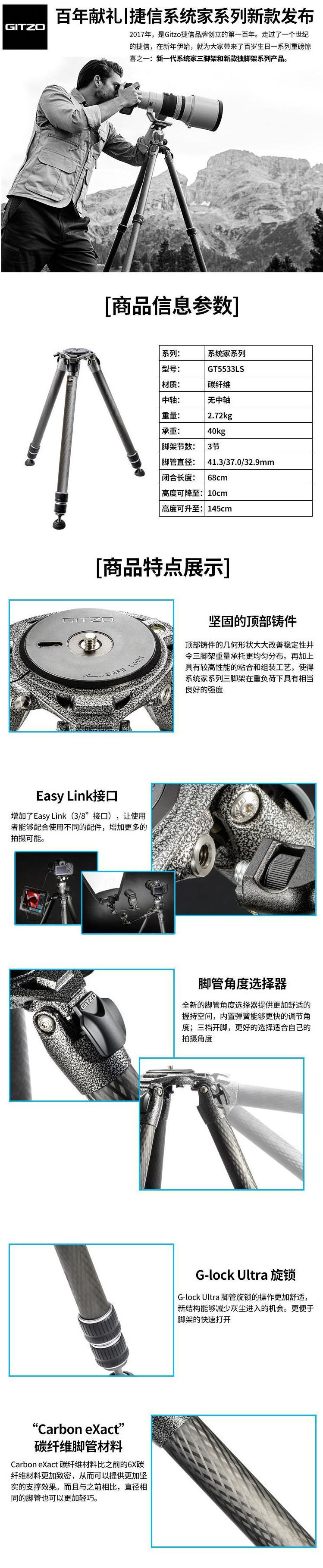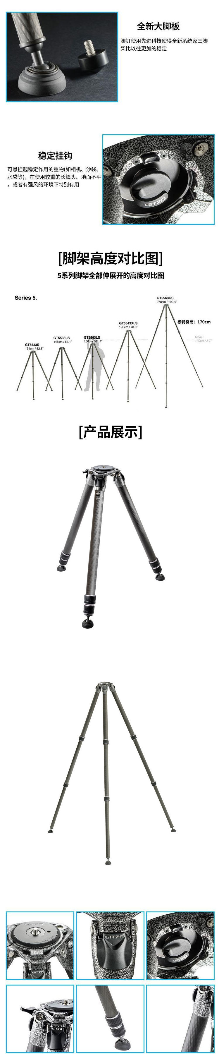 捷信 GITZO GT5533LS 新款 系统家 碳纤维 观鸟 摄影 摄像 无中轴 5号 三节 三脚架