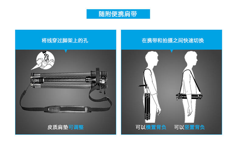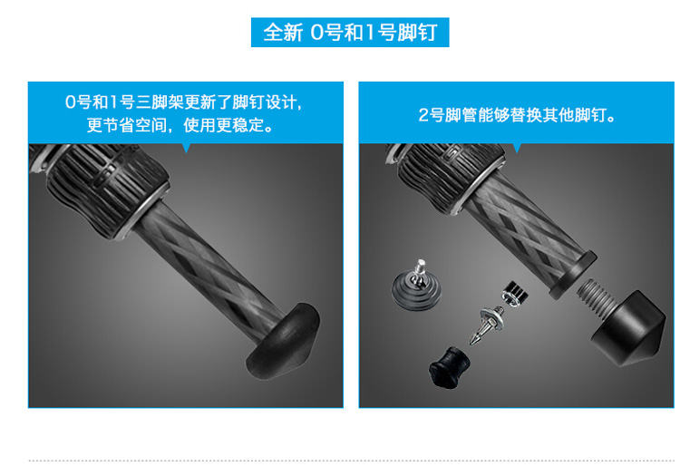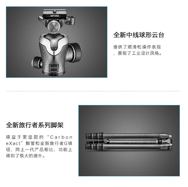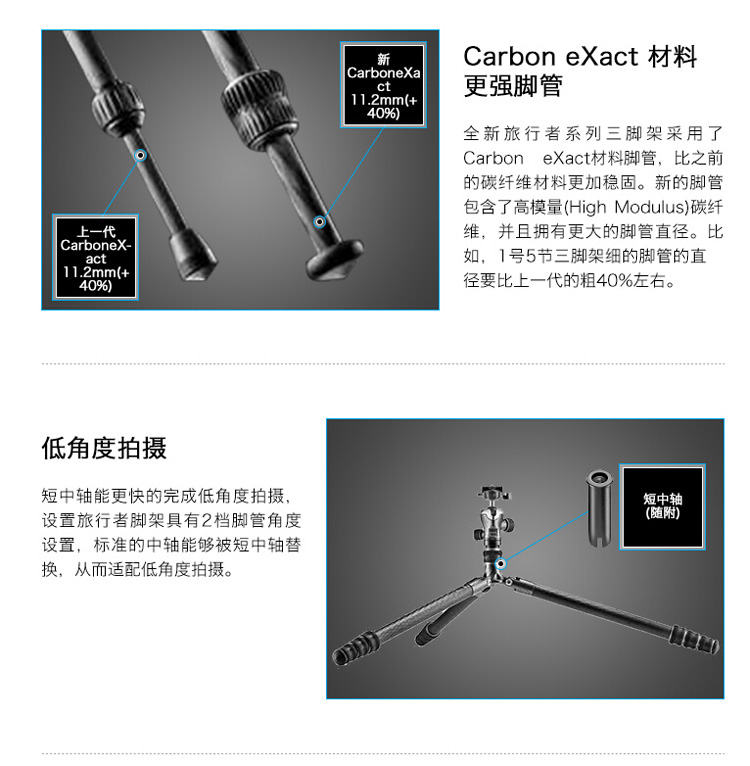 全新旅行者系列三脚架采用了Carbon eXact材脚管,比之前的碳纤维材料更加稳固,新的脚管包含了高模量碳纤维,并且拥有更大的脚管直径
