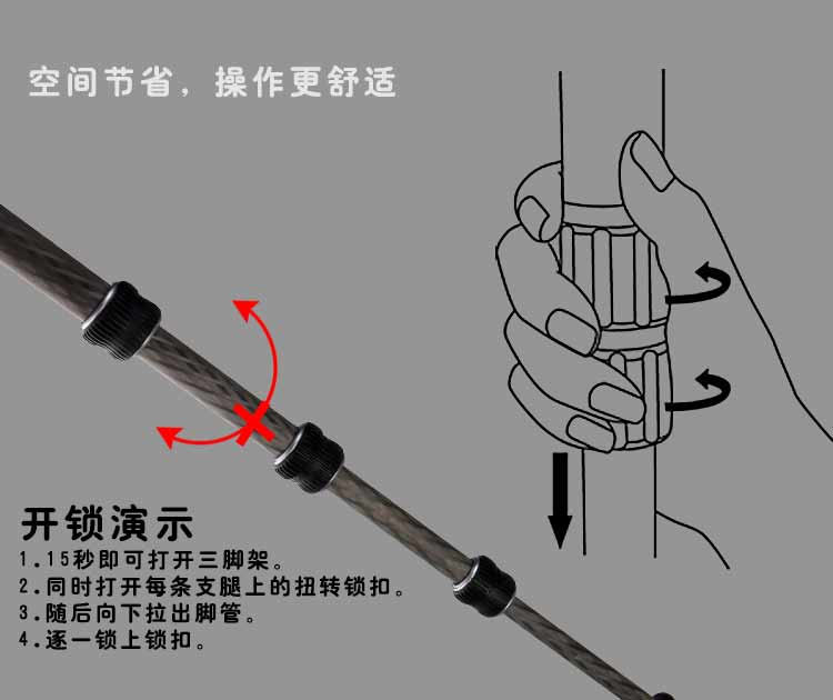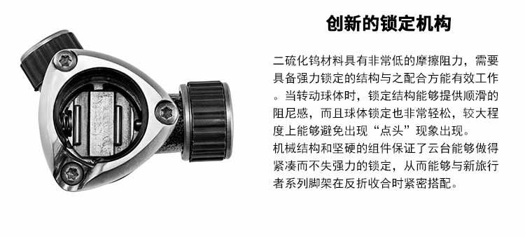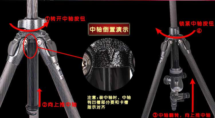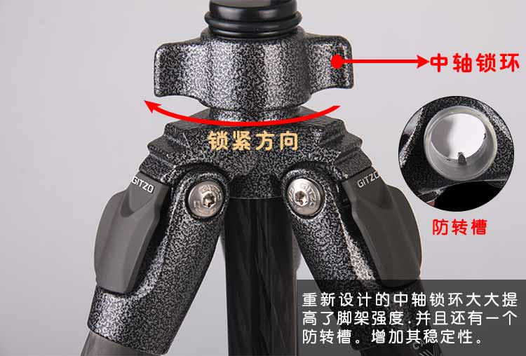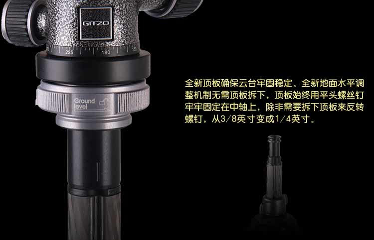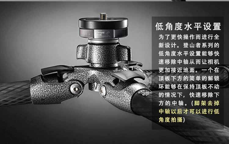 在脚架顶板下方的解锁环能够在保持顶板不动的情况下,快速移除下方的中轴,让相机更加接近地面 重新设计的主铸件和中轴锁进一步加强稳定性