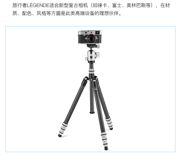 旅行者LEGENDE适合新型复古相机,在材质、配色、风格等方面是此类高端设备的理想伙伴。套装内含古董型皮肩带,手感舒适, 保证脚架携带式的便利性