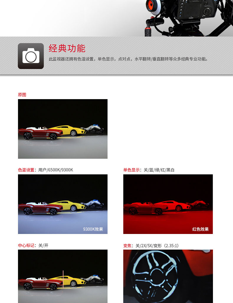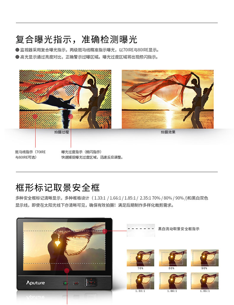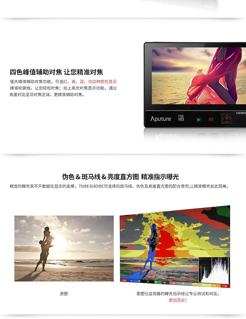 众多专业功能达到电影级标准,四色峰值辅助对焦让您精准对焦;原创复合曝光功能,伪彩、斑马线、亮度直方图等功能精准指示曝光;音频电平表可实时监看声音信息。