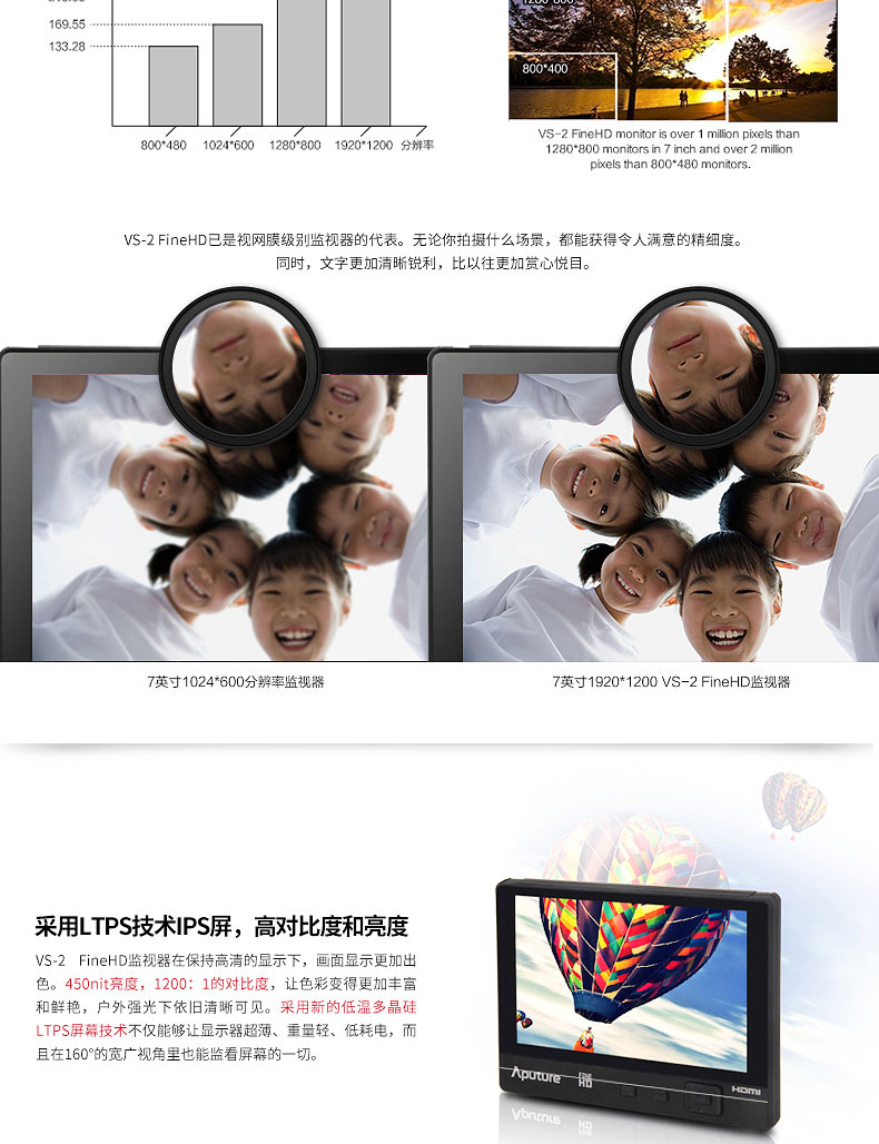 1.此监视器的分辨率为惊人的1920X1200,清晰画质挑战视网膜,满足您对高清画质的苛刻要求!液晶屏幕新采用LTPS技术,更高的对比度和亮度,监看画面更清晰!