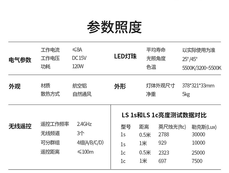 LS 1s 8A DC 15V 120W 25° 5500K 自然对流 2.4GHz 1/2/3 A/B/C/D ≤100m