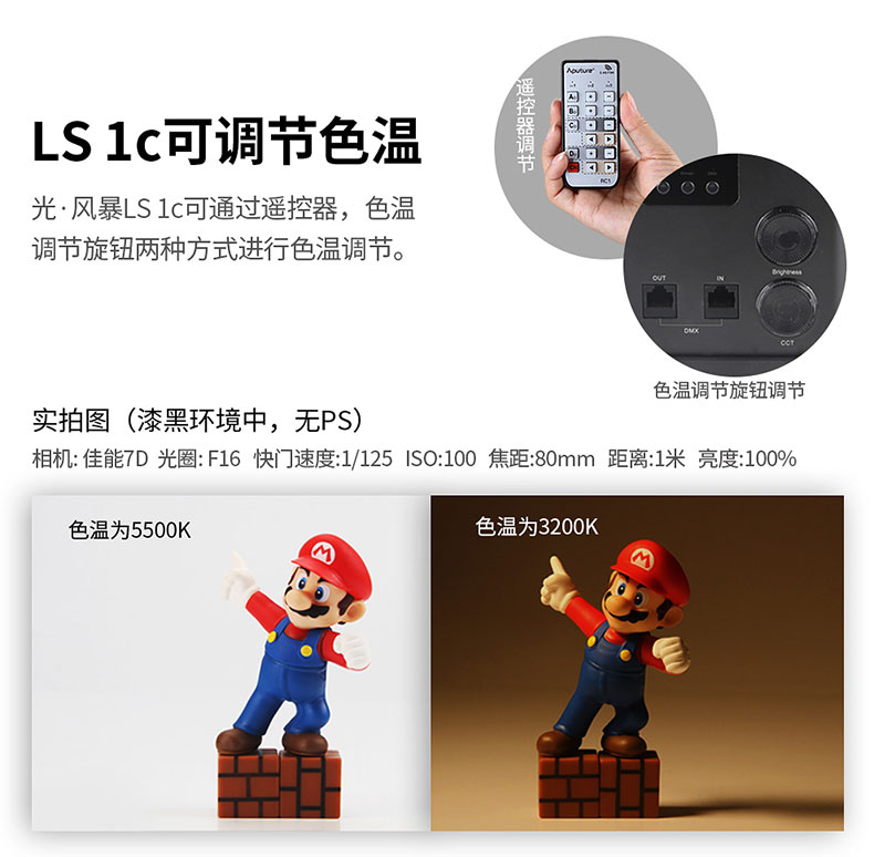 光风暴LS1c是3200K—5500K双色温。满足您多变的场景变化需求。色温调节可由DMX控制台、遥控器、控制盒上的调节旋钮来调节。