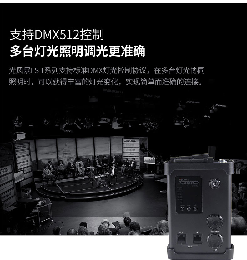 LS 1的亮度可以通过国际标准DMX 512灯光控制协议的DMX控制台控制,能在多台灯光协同照明下,可以获得极为丰富的光效效果。