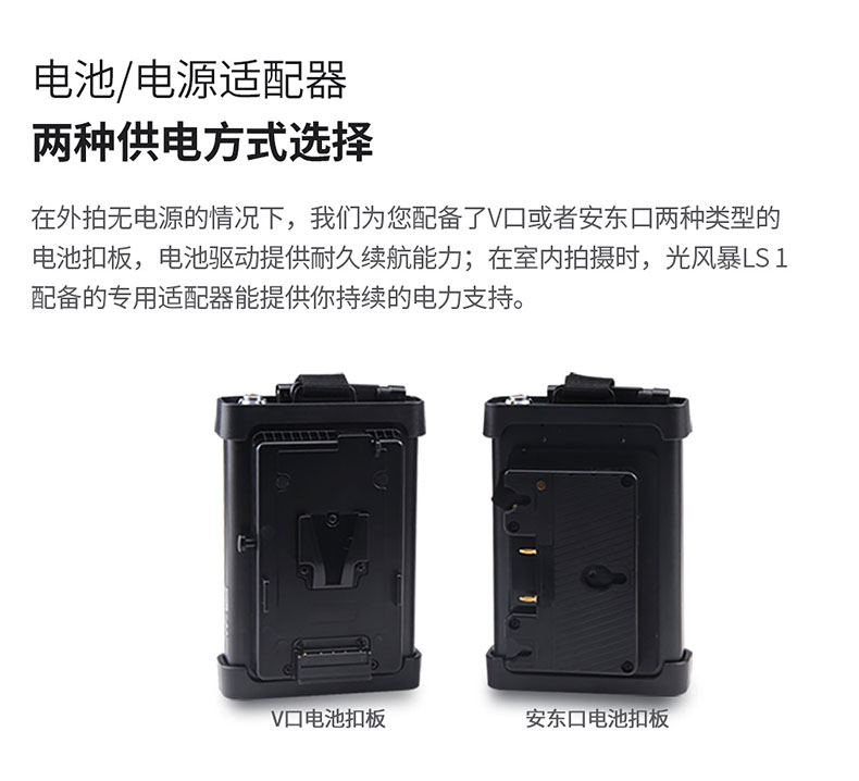 可以使用两种方法为LS 1供电。索尼V口电池或安东口电池可用于户外或定位拍摄。适配器可用于室内拍摄。