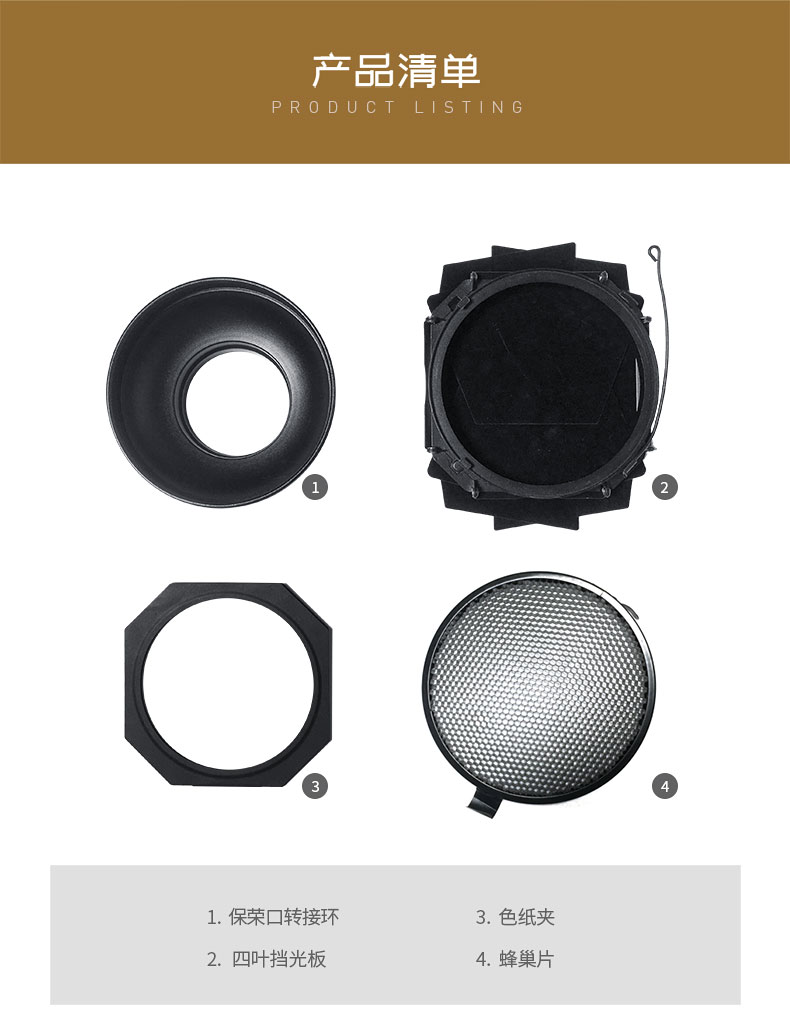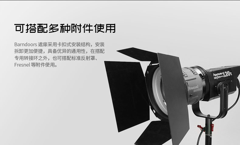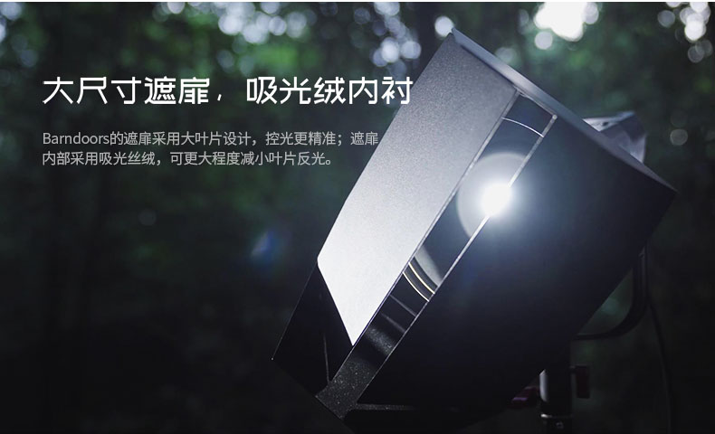 Barn Doors采用卡扣式安装结构,安装和拆卸快捷方便。 除了特殊的转接环外,还可以安装在7英寸标准罩,菲涅耳和其他兼容配件上。