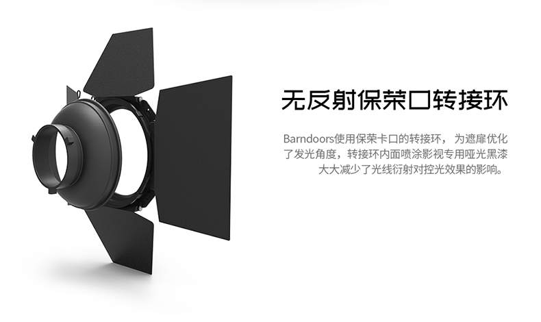 Barn Doors 使用独家设计基于标准卡口(Bowens)的转接环,为遮扉优化了发光角度,转接环内面喷涂影视专用哑光黑漆,较大程度减少光线衍射对较终控光效果的影响。