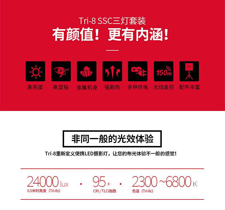 Tri8-C版本(较大亮度可达23000Lux@0.5m,可调色温范围2300K-6800K)