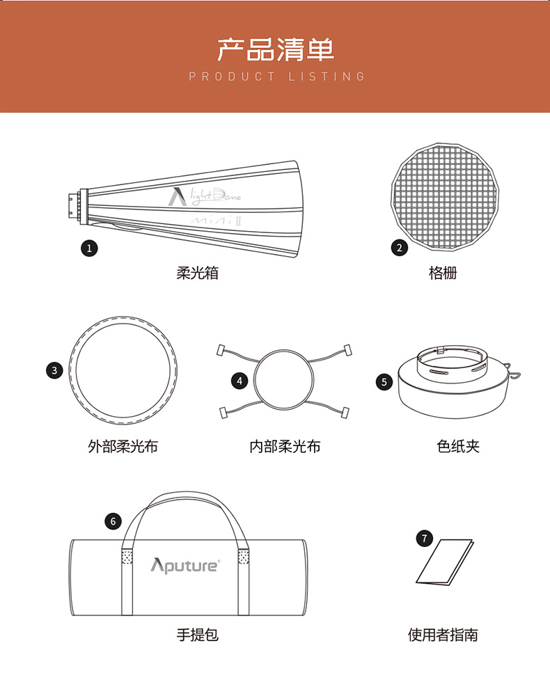 标配内容:柔光箱,格栅,外部柔光布,内部柔光布,色纸夹,手提包,使用者指南