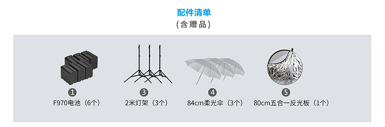 赠送:2米灯架*3、柔光伞*3、反光板*1
