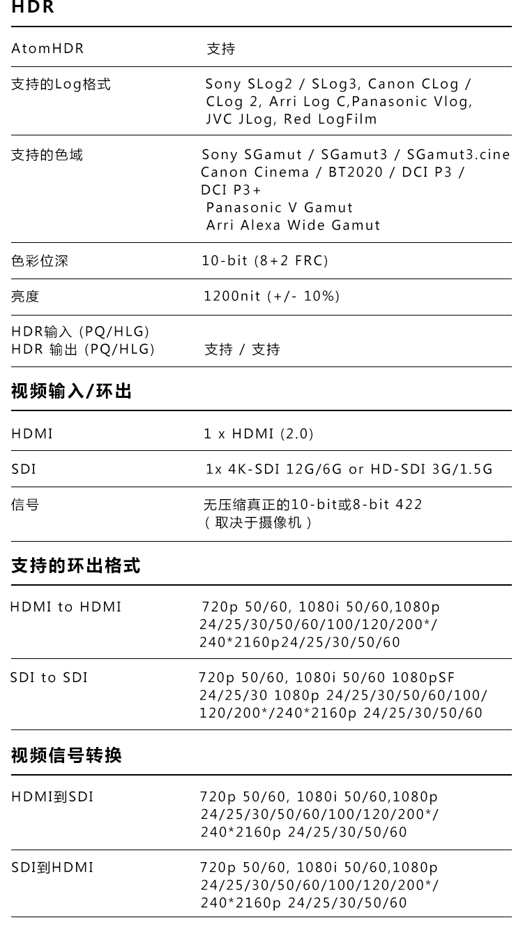 | SDI到HDMI | 720p 50/60, 1080i 50/60,1080p 24/25/30/50/60/100/120/200*/240*2160p 24/25/30/50/60 |