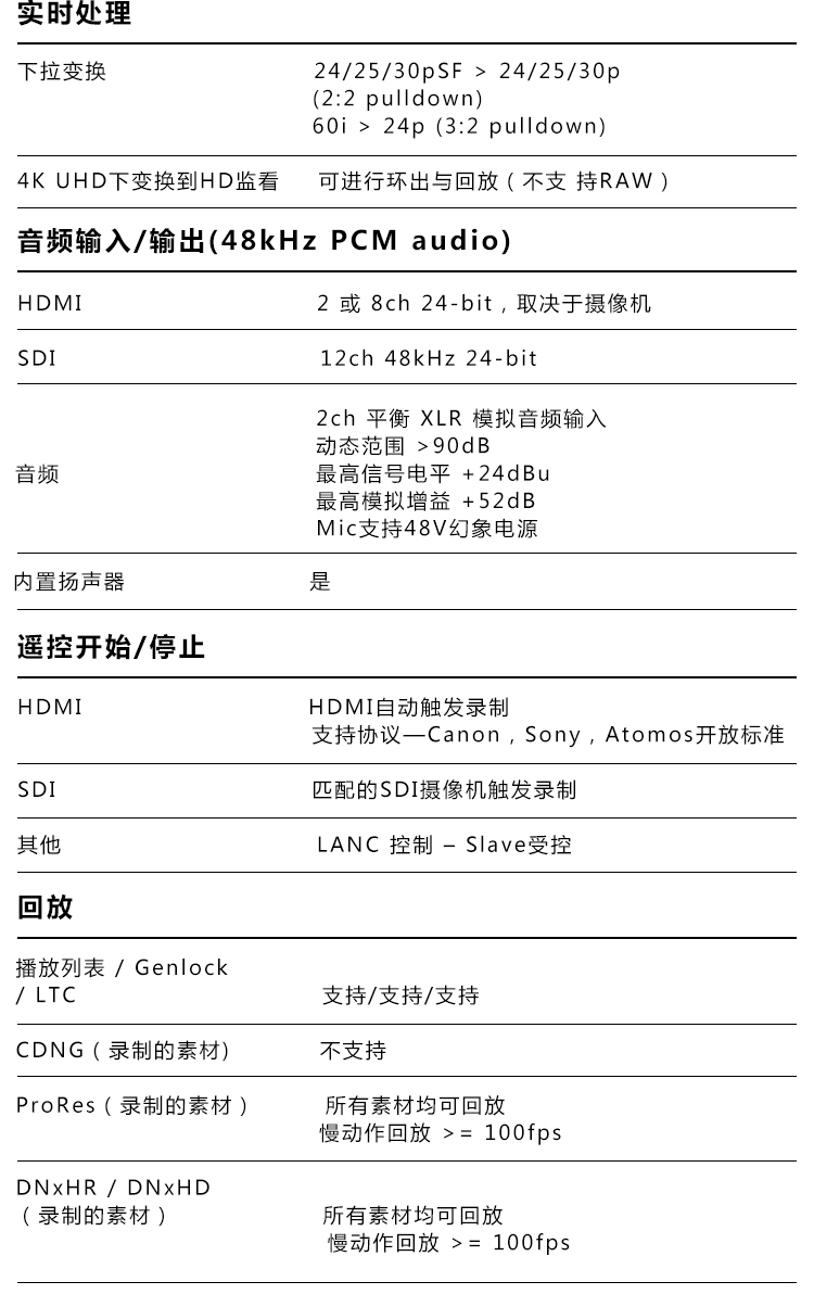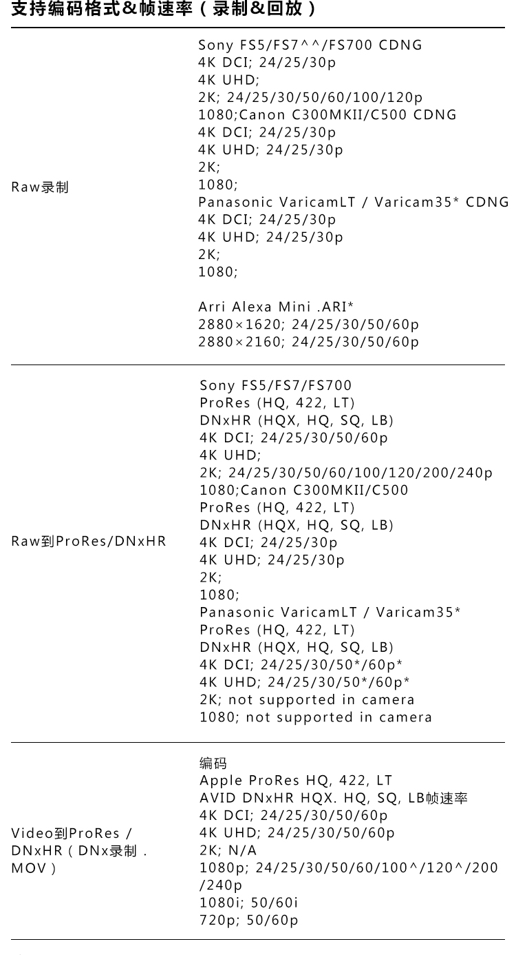 | Raw录制 | Sony FS5/FS7^^/FS700 CDNG 4K DCI; 24/25/30p 4K UHD; 2K; 24/25/30/50/60/100/120p 1080;Canon C300MKII/C500 CDNG 4K DCI; 24/25/30p 4K UHD; 24/25/30p 2K; 1080;Panasonic VaricamLT / Varicam35* CDNG 4K DCI; 24/25/30p 4K UHD; 24/25/30p 2K; 1080;Arri Alexa Mini .ARI* 2880×1620; 24/25/30/50/60p 2880×2160; 24/25/30/50/60p | |