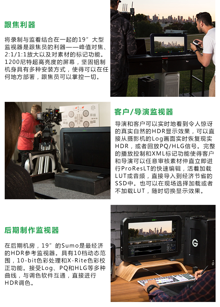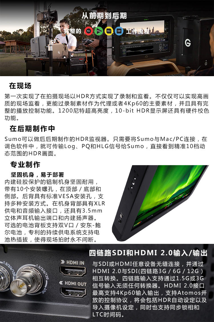 | 可选购附件 | Atomos原装HDMI线缆、硬盘坞站、原装遮光罩、电池挂板、Sumo监视器安装飞行箱、Sumo监视器航空运输箱、魔术腿连接件 |