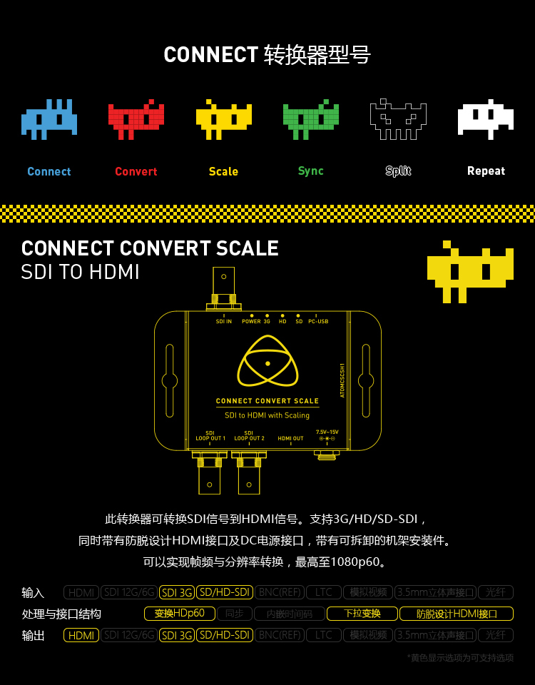 具有全尺寸3G/HD/SD-SDI,可锁定的HDMI,可锁定的直流电源,可移动的包括安装耳和转换/帧率/分辨率,可扩展到高清1080p60。