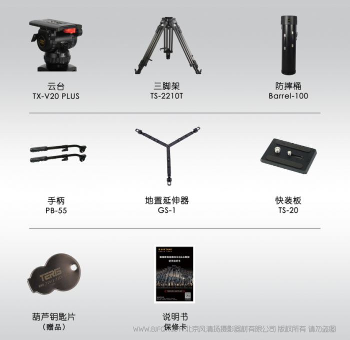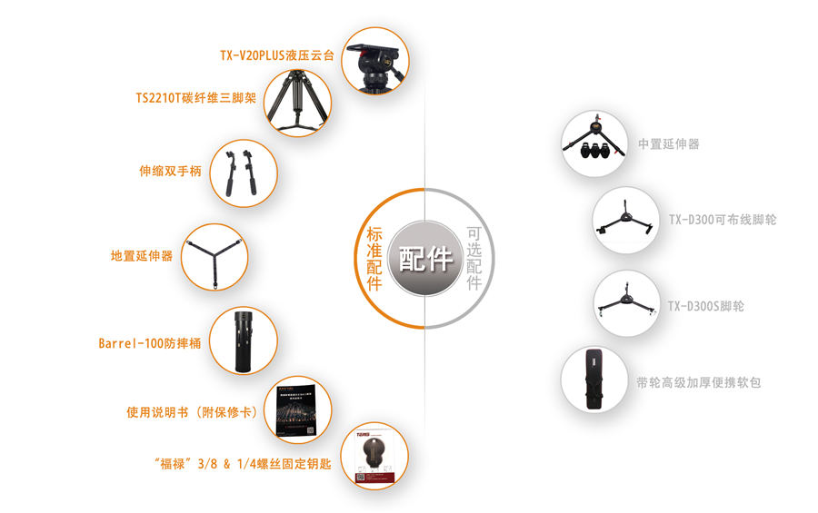 TX-V20PLUS液压云台,TS2210T碳纤维三脚架,伸缩双手柄,地置延伸器 ,Barrel-100防摔桶,使用说明书(附保修卡),福禄 3/8 & 1/4螺丝固定钥匙