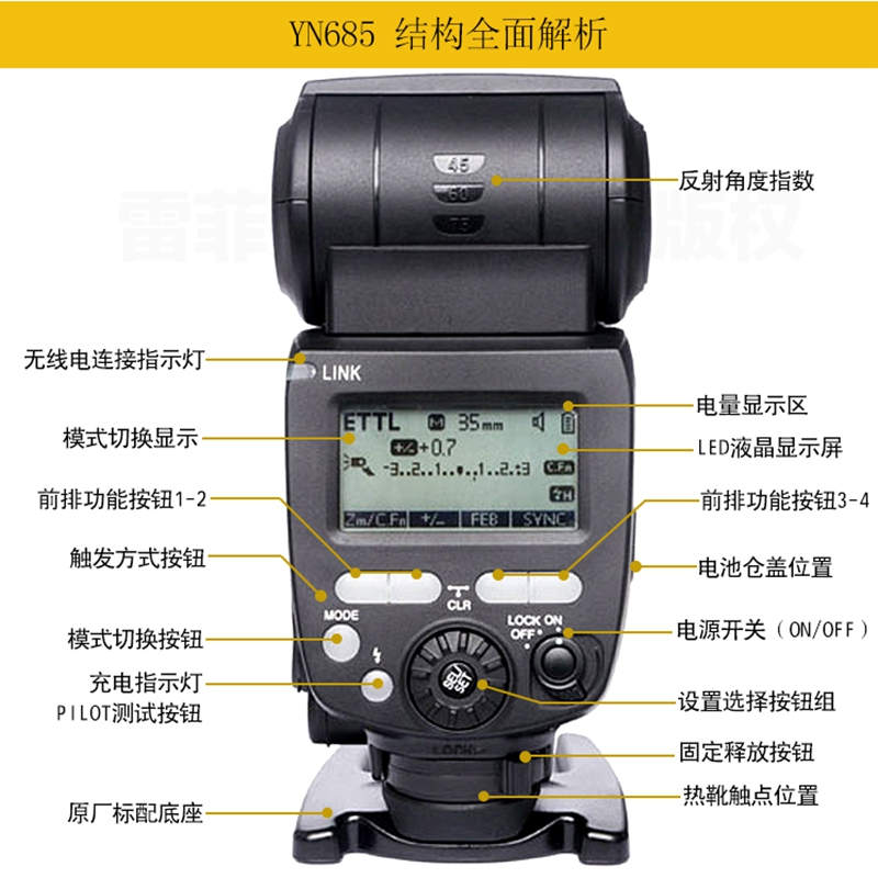 YN685为2.4GHz无线电大指数闪光灯,支持TTL、M、Multi模式。