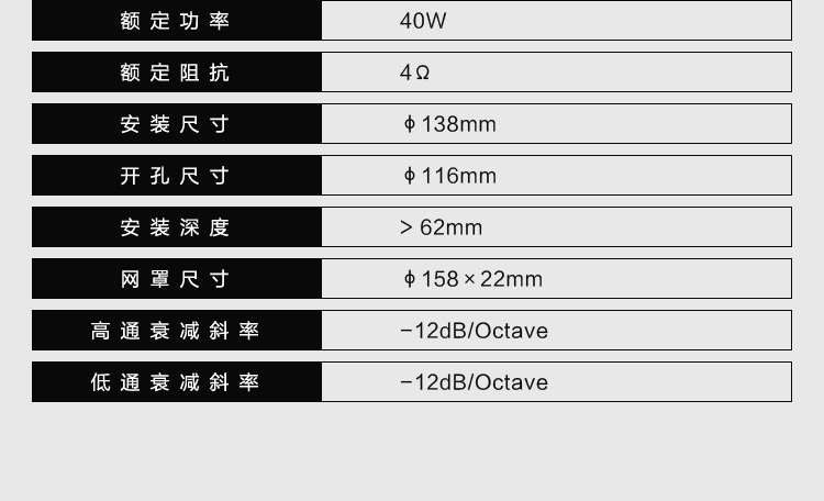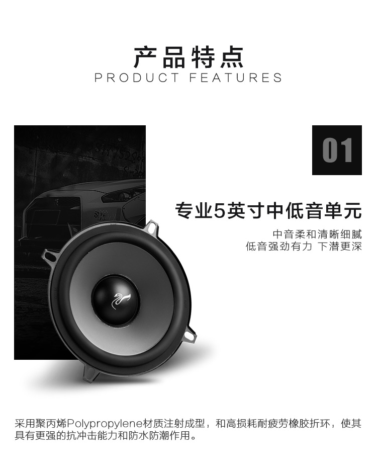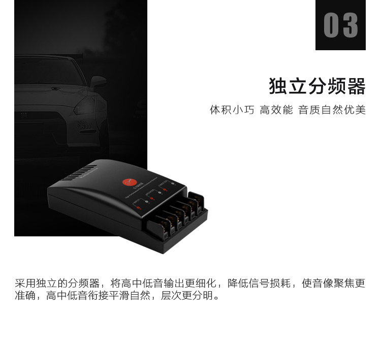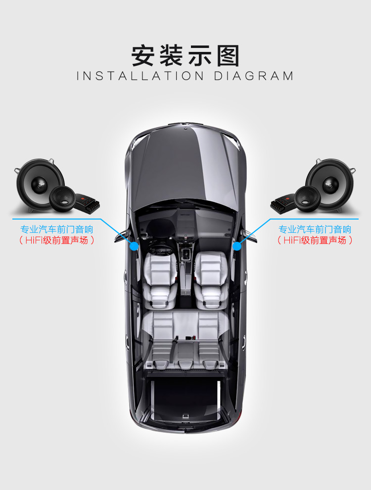 Coaxial system 高低音单元一体化,结构紧凑,极大地方便了用户的安装, Component System 采用独立的分音器,音像聚焦准确,高低音衔接平滑自然,其高音头可以做倾斜 300 的全旋转 , 这个功能可以让听音者在其特定辐射区域内享受到较真实和完美的声音,还用了三种不同的安装方式,较大程度的扩展了安装的便利性,并且可以根据用户的喜好更换高音前后外饰。