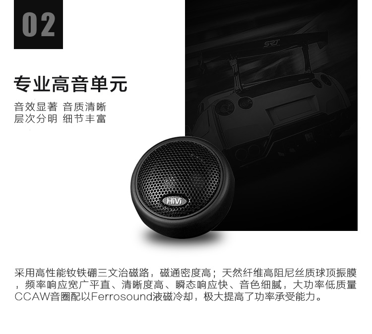 HiVi 汽车音响产品深受同行、客户一贯的信赖和关注,每一次产品的面世,都保持 HiVi 所具有的高清晰度、低失真等风格,无论是叱咤风云的 D 系例高端产品,或者是价格相当诱惑的普通扬声器系统都是如此,这一灵魂的保持,充分体现 HiVi 工厂所具有的生产,研发等综合实力,面对纷繁复杂的市场竟争,我们不断在产品中运用科技手段,给产品不断增值,满足市场用户的需求,秉承惠威一贯的 HI-END 理念,声音准确、音色圆润、声场宽阔,加上毫无保留的细节重现,让您感受真正的音乐。