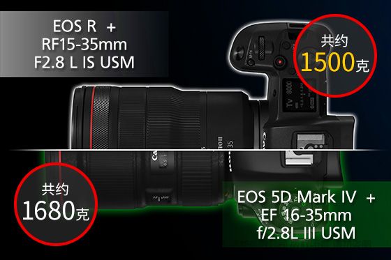 超广角扩大到15mm,并增加了IS影像稳定器的基础上,将镜头尺寸维持在了与EF 16-35mm f/2.8L III USM基本相同的水平上。在搭配EOS R使用时重量仅约1500克,比EOS 5D Mark IV搭配EF 16-35mm f/2.8L III USM的约1680克更轻。可有效减少用户长时间携带与拍摄时的负担,提供更好的携带与拍摄体验。