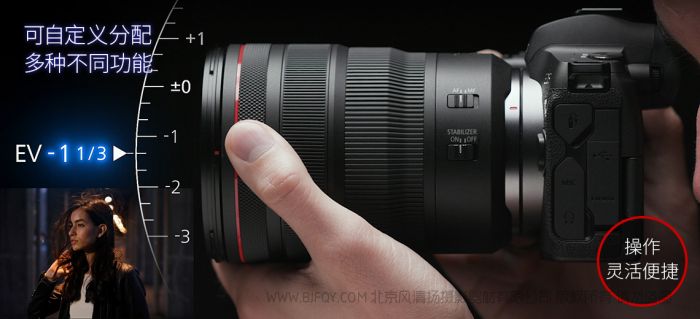 控制环功能可自定义,可以将原本在相机上调整的光圈、快门速度、ISO感光度以及曝光补偿等功能,分配到镜头的控制环上。