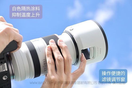 RF镜头中首款白色镜头,采用了白色隔热涂料,在炎炎烈日下,长时间拍摄也能抑制镜头温度的上升。附带的镜头遮光罩ET-83F(W III)也采用了与镜身相同的白色涂装,增加了与镜头的融合感。此外,遮光罩带有滑动式的圆形偏光滤镜调节窗,在使用偏光滤镜等拍摄时,无须取下遮光罩便可轻松进行调节,提高了拍摄效率。