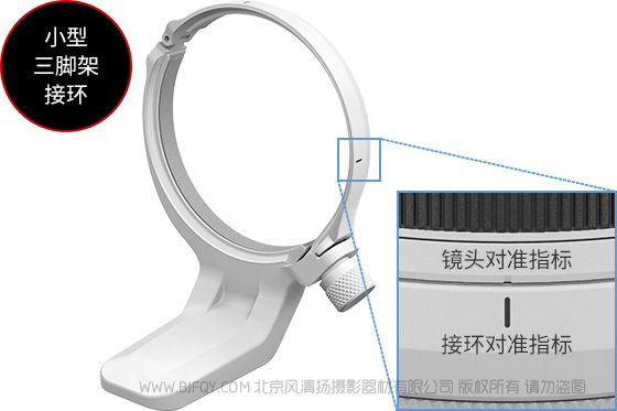 为了配合长度大幅缩短,镜身小型化的镜头,佳能新开发了小型三脚架接环。三脚架接环的安装简单便捷,安装在镜头上也不会影响到镜头小型化的特点。不仅如此,当安装在三脚架上进行拍摄时,可以参考接环上的对准指标,将镜头指标与之对准,从而轻松切换纵向与横向构图。