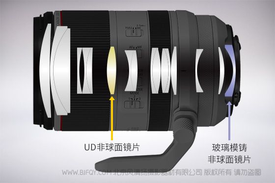 佳能开发的UD镜片是具有低折射、低色散特点的光学镜片。通过采用超级UD镜片及UD镜片,提高了二次光谱的消除效果,两片UD镜片可实现与一片萤石镜片接近的效果,具有良好的色像差补偿性能。而一片超级UD镜片可提供相当于约两片UD镜片的效果,进一步为镜头的高性能化和小型化做出贡献。