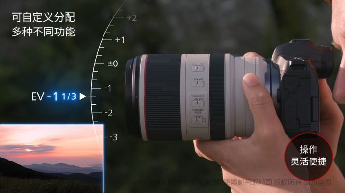 控制环功能可自定义,可以将原本在相机上调整的光圈、快门速度、ISO感光度以及曝光补偿等功能,分配到镜头的控制环上。
