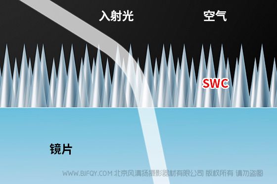 在镜片表面排列众多纳米级楔形结构的SWC亚波长结构镀膜,对入射角较大光线具有很好的防反射效果。可有效抑制大曲度镜片边缘部眩光与鬼影的产生。