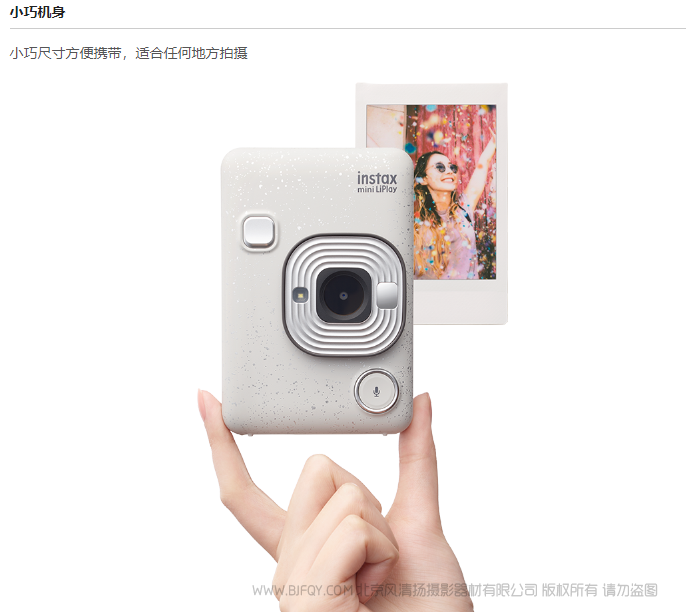 instax相机系列中较轻的。可通过连接智能手机体验丰富多样的功能,方便随身携带,随时拍摄。