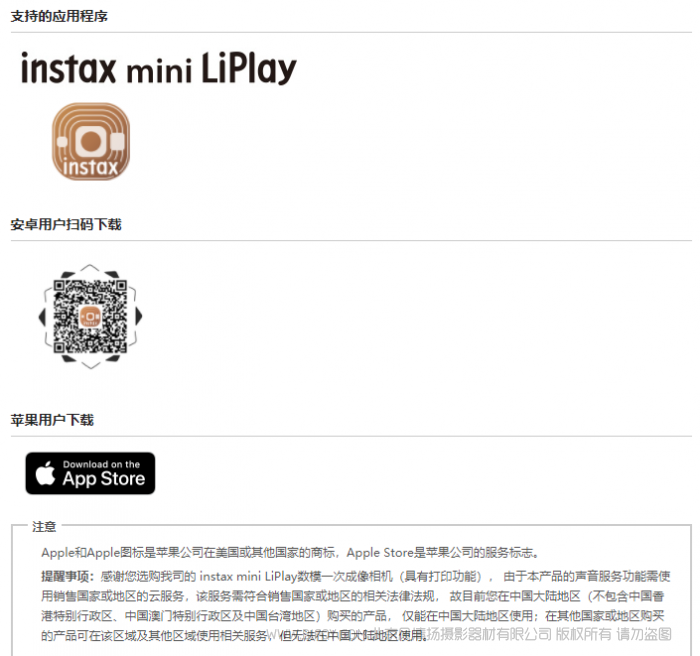 提醒事项:感谢您选购我司的 instax mini LiPlay 数模一次成像相机(具有打印功能),由于本产品的声音服务功能需使用销售国家或地区的云服务,该服务需符合销售国家或地区的相关法律法规,故目前您在中国大陆地区(不包括中国香港特别行政区、中国澳门特别行政区及中国台湾地区)购买的产品。仅能在中国大陆地区使用;在其他国家或地区购买的产品可在该区域及其他区域使用相关服务,但无法在中国大陆地区使用。